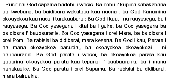 Translation In the beginning God created heaven and earth. The earth was formless and empty, and darkness covered the deep water. The spirit of God was hovering over the water. Then God said, "Let there be light!" So there was light. God saw the light was good. So God separated the light from the darkness. God named the light "day", and the darkness he named "night". There was evening, then morning, the first day.