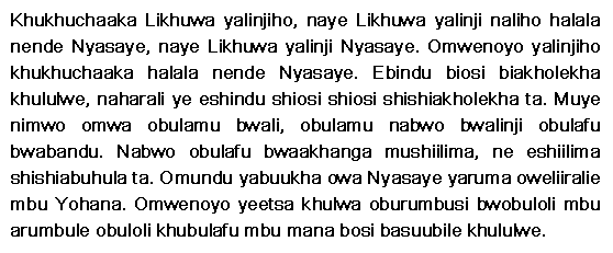 Translation In the beginning was the Word, and the Word was with God, and the Word was God. The same was in the beginning with God. All things were made by him, and without him was not any thing made that was made. In him was life, and the life was the light of men. And the light shineth in darkness, and the darkness comprehended it not. There was a man sent from God, whose name was John. The same came for a witness, to bear withness of the Light, that all men through him might believe.